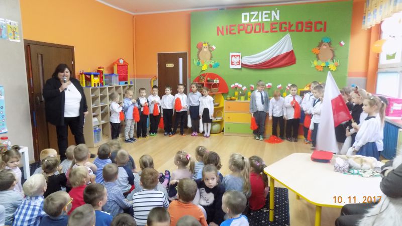 PRZEDSZKOLAKI W SKUPIENIU I Z POWAGĄ WYSŁUCHAŁY CAŁEJ HISTORII ORAZ UTRWALIŁY WIADOMOŚCI NA TEMAT SYMBOLI NARODOWYCH. NASTĘPNIE PAMIĘTAJĄC O ZACHOWANIU NALEŻYTEJ POSTAWY WSPÓLNIE ODŚPIEWAŁY HYMN POLSKI,, MAZUREK DĄBROWSKIEGO''. TEN DZIEŃ NIEPODLEGŁOŚCI STAŁ SIĘ BARDZO RADOSNYM DNIEM W NASZYM PRZEDSZKOLU I ZAPADNIE ON W PAMIĘCI NASZYCH,, MAŁYCH POLAKÓW''.