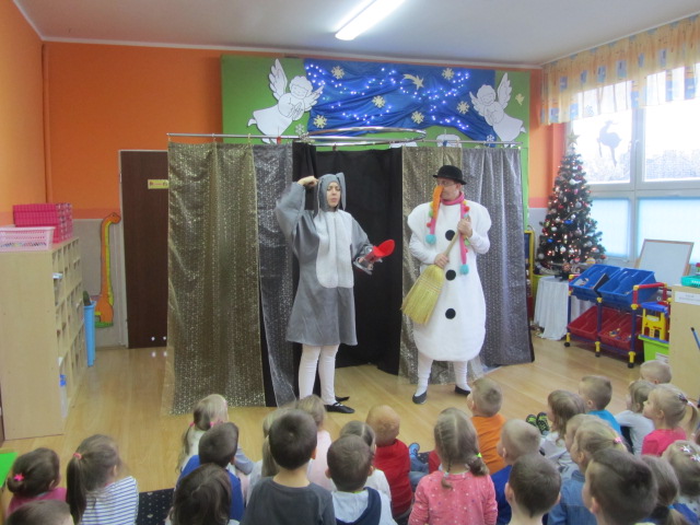Opublikowano: 04-01-2018W dniu dzisiejszym nasze przedszkole odwiedził Teatr Gargulec z przedstawieniem ,, Baśń zimowa''. Wesoły spektakl o przygodach Bałwanka, uczący dzieci zasad bezpieczeństwa w zimowej porze roku. W przedstawieniu pojawia się wiele barwnych postaci, między innymi Zajaczek, Pani Mróz. Czy wszystkie śnieżynki są takie same? Bałwanek będzie próbował rozwiązać tę zagadkę. Wszystkiemu towarzyszyła świąteczna muzyka wprowadzjąc do przedszkola zimowy nastrój.