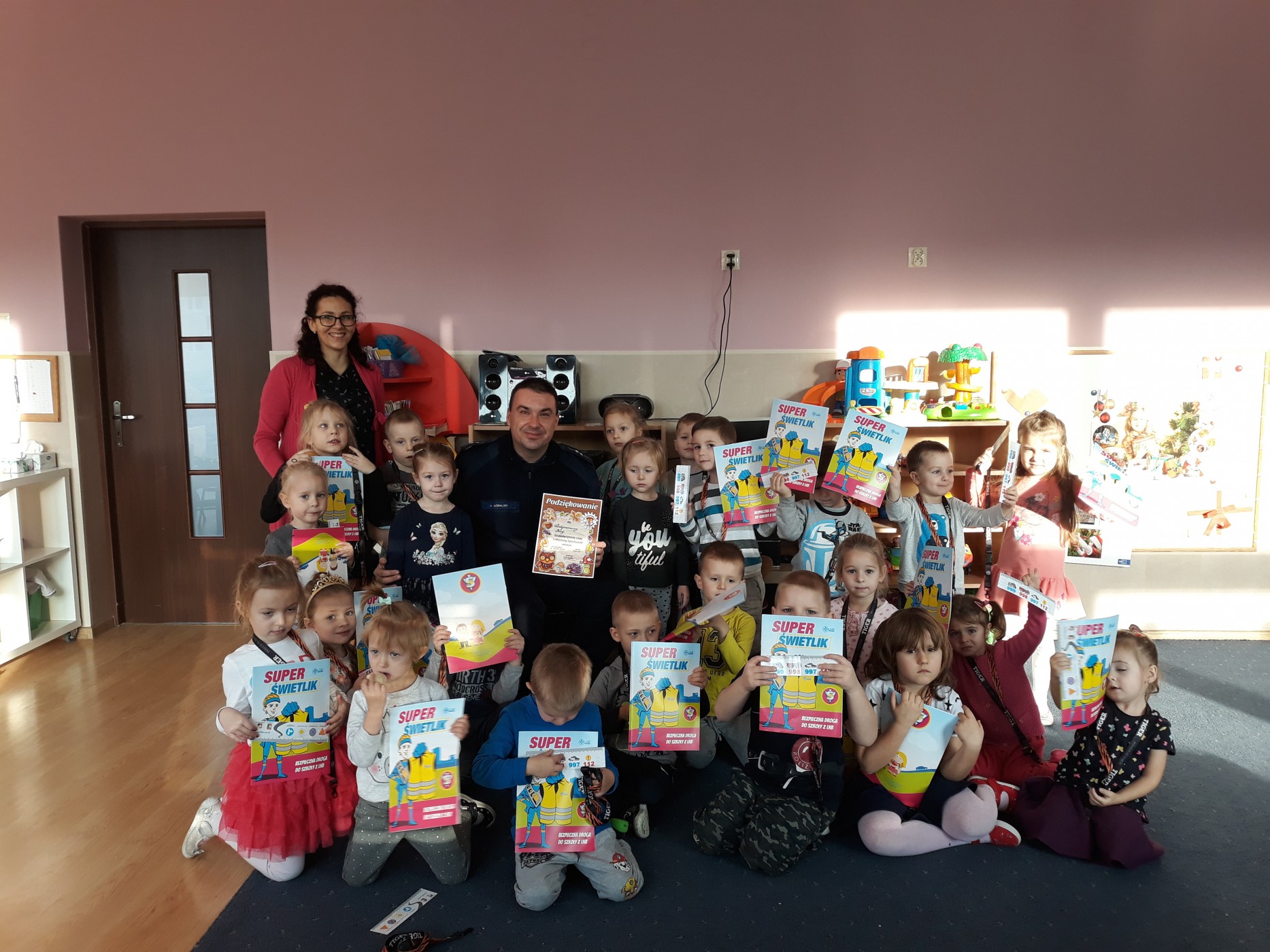 19 grudnia do grupy Kubusiów przyjechał z wizytą funkcjonariusz Komendy Powiatowej Policji w Wągrowcu. Tematem spotkania było utrwalenie z dziećmi zasad ruchu drogowego oraz przypomnienie zagadnień dotyczących bezpieczeństwa dzieci w przedszkolu i w domu. Dzieci zapoznały się z zasadami bezpiecznego poruszania się podczas przechodzenia przez jezdnię oraz zapamiętały ważne numery alarmowe tj.112 i 997. Policjant uświadomiły przedszkolaków o konieczności jeżdżenia w fotelikach z zapiętymi pasami, a następnie wytłumaczył jak należy zachować się w kontaktach z obcymi ludźmi oraz jak dbać o bezpieczeństwo własne i innych jak i również, do kogo zwracać się o pomoc w sytuacji zagrożenia. Dzieci z dużym zainteresowaniem słuchały rad i wskazówek zaproszonego gościa. Na zakończenie wizyty przedszkolaki wręczyły panu policjantowi podziękowanie oraz zatańczyliśmy wspólnie świąteczne piosenki. Dzieci otrzymały upominki w postaci kolorowanki Super Świetlika, smycz do kluczy i zakładkę do książki. Po zajęciach pełnych wrażeń Hania poczęstowała wszystkich ciasteczkami, które upiekła z mamą.
