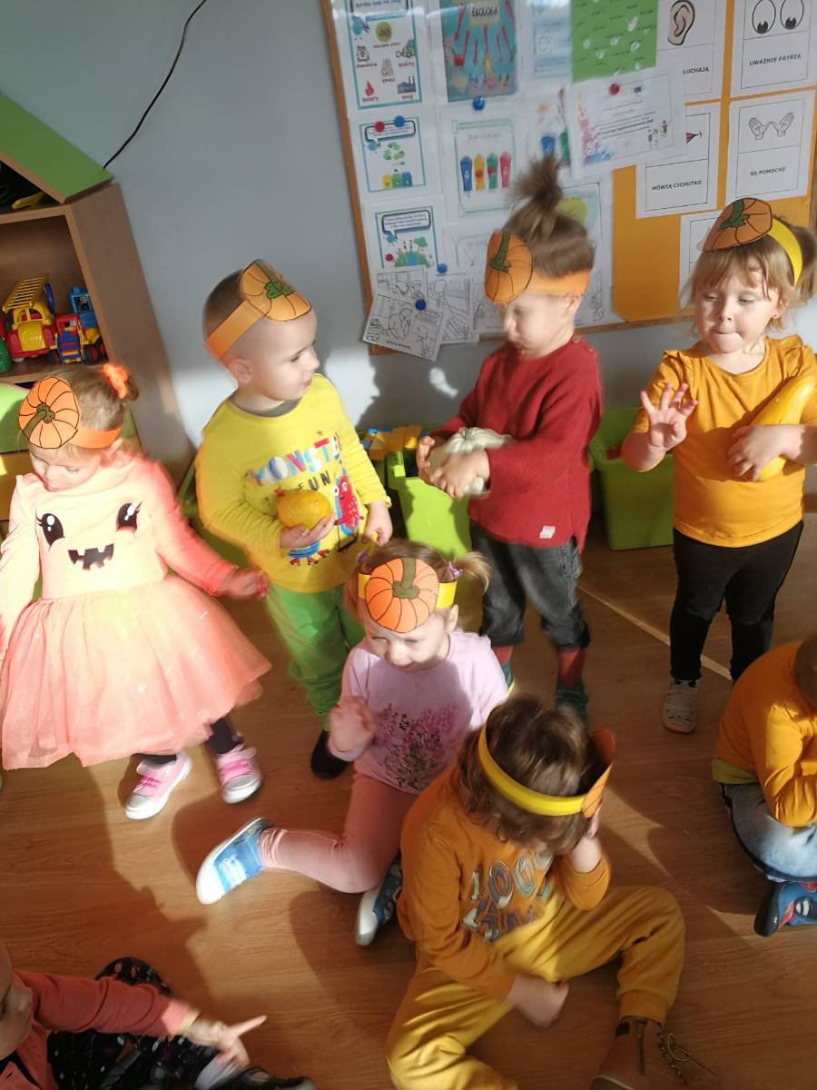 Opublikowano: 30-10-2020Dzisiaj Krasnoludki obchodziły Dzień Dyni. Wszystkie zabawy tematycznie związane były z tym warzywem. Dzieci tańczyły w opaskach z dynią, ubrani też byli w kolorze dyni. Najbardziej podobały się rymowanki o tym wielkim warzywie.