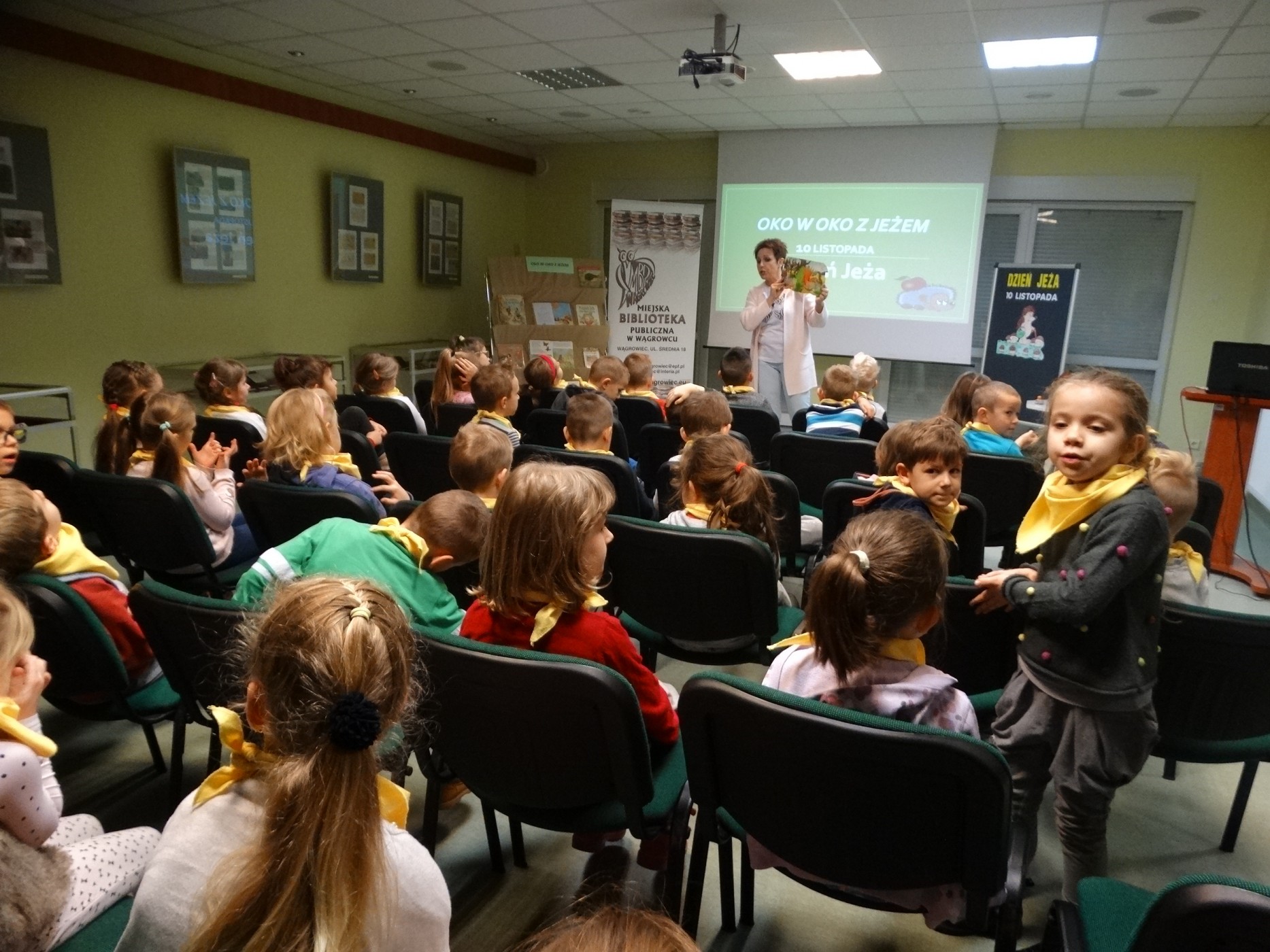 Opublikowano: 18-11-201810 listopada obchodzony jest Międzynarodowy Dzień Jeża. Z tej okazji dzieci z grupy Mali Odkrywcy i Mali Podróżnicy zostały zaproszone do Miejskiej Biblioteki Publicznej. Dzieci dowiedziały się wielu ciekawostek na temat życia jeży. Służyła temu wystawa książek popularnonaukowych, bajek, opowiadań i wierszy o jeżach. Pogadanka miała na celu zwrócenie uwagi na fakt iż zwierzęta te są gatunkiem zagrożonym. Następnie dzieci wysłuchały wiersza pt. „Jeż u fryzjera” i odgadywały zagadki. Na zakończenie wszystkie dzieci obejrzały bajkę pt. „ Strażak Sam”.