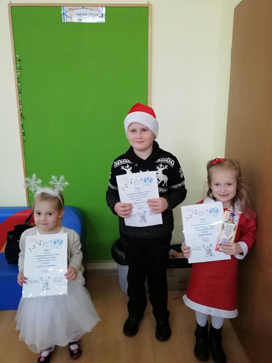 Opublikowano: 15-12-201912 grudnia 2019 roku w Przedszkolu nr 2 odbył się „Festiwal Piosenki Zimowo – Świątecznej w języku angielskim”. Podczas festiwalu troje dzieci z naszego przedszkola zaprezentowało swoje zdolności wokalne i językowe. Jury konkursowe postanowiło wyróżnić wszystkich uczestników nagrodami i dyplomem.