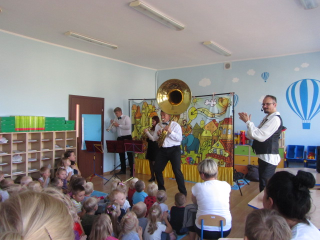Opublikowano: 18-09-2018Dzisiaj w przedszkolu odwiedzili nas artyści z Poznańskiej Filharmonii Pomysłów. Tematem przedstawienia teatralno – muzycznego był Plac Artysty Suzofonisty. Dzieci w bardzo ciekawy i wesoły sposób poznały instrumenty takie jak: trąbka, waltornia, suzafon. Poznały również smutnego słonia, który skarżył się na zbyt długą trąbę. Ale jak to w bajkach bywa wszystko skończyło się dobrze;)