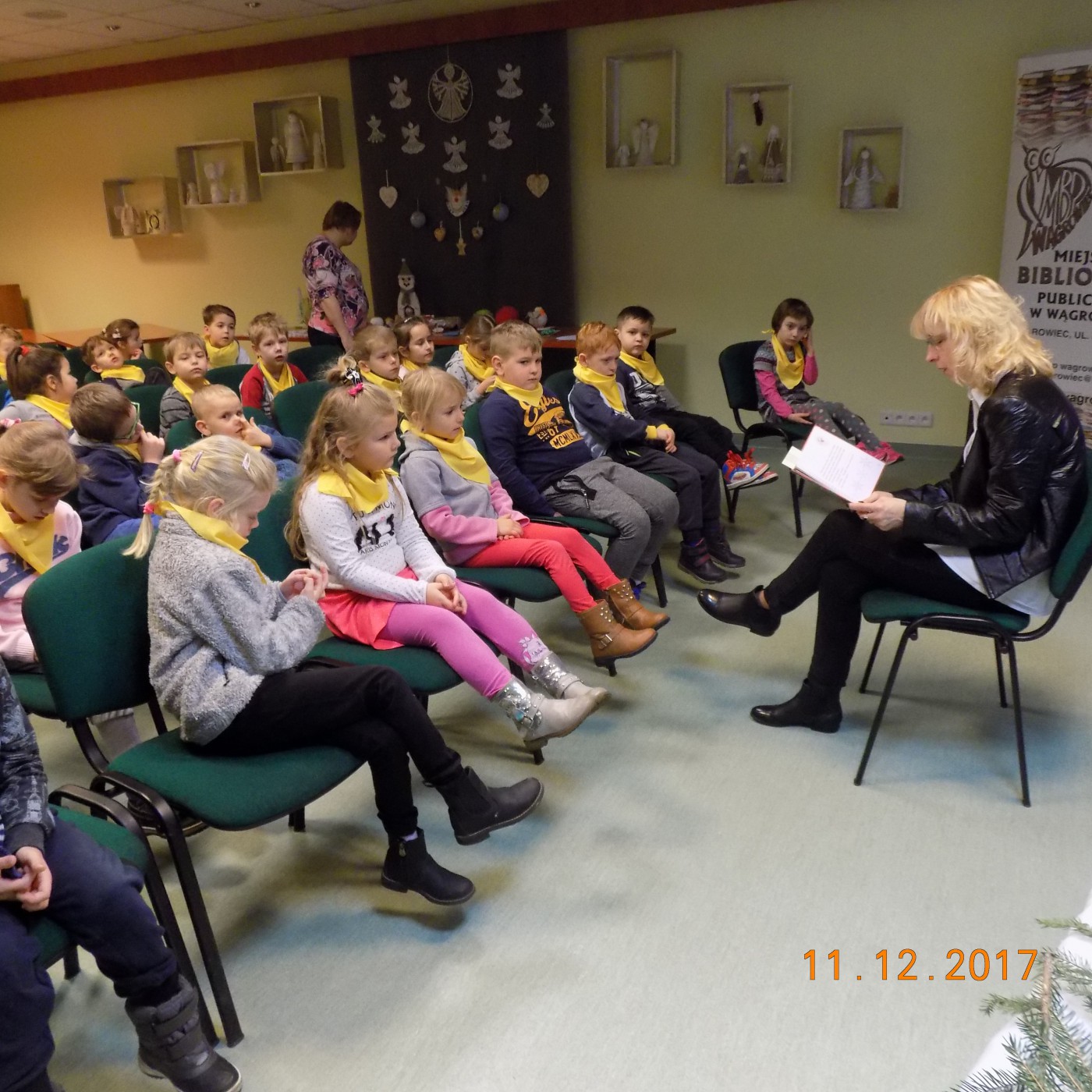 Opublikowano: 11-12-2017,,Hu hu ha , zima zła''- pod takim hasłem odbyło sie kolejne spotkanie dzieci z grupy Małych Odkrywców oraz Małych Podrózników w Miejskiej Bibliotece Publicznej. Zajęcia rozpoczęły się od pokazu multimedialnego, z którego dzieci dowiedziały się o zimie i zjawiskach z nią związanych, o sportach zimowych oraz o tym jak zwierzęta i rośliny przygotowują się do zimy .Dzieci aktywnie włączyły się do rozmowy o urokach tej pory roku. Następnie z dużym zainteresowaniem wysłuchały opowiadania pt.,, Kiedy spadnie śnieg?'' a na koniec obejrzały bajkę ,,Wieczór wigilijny''.