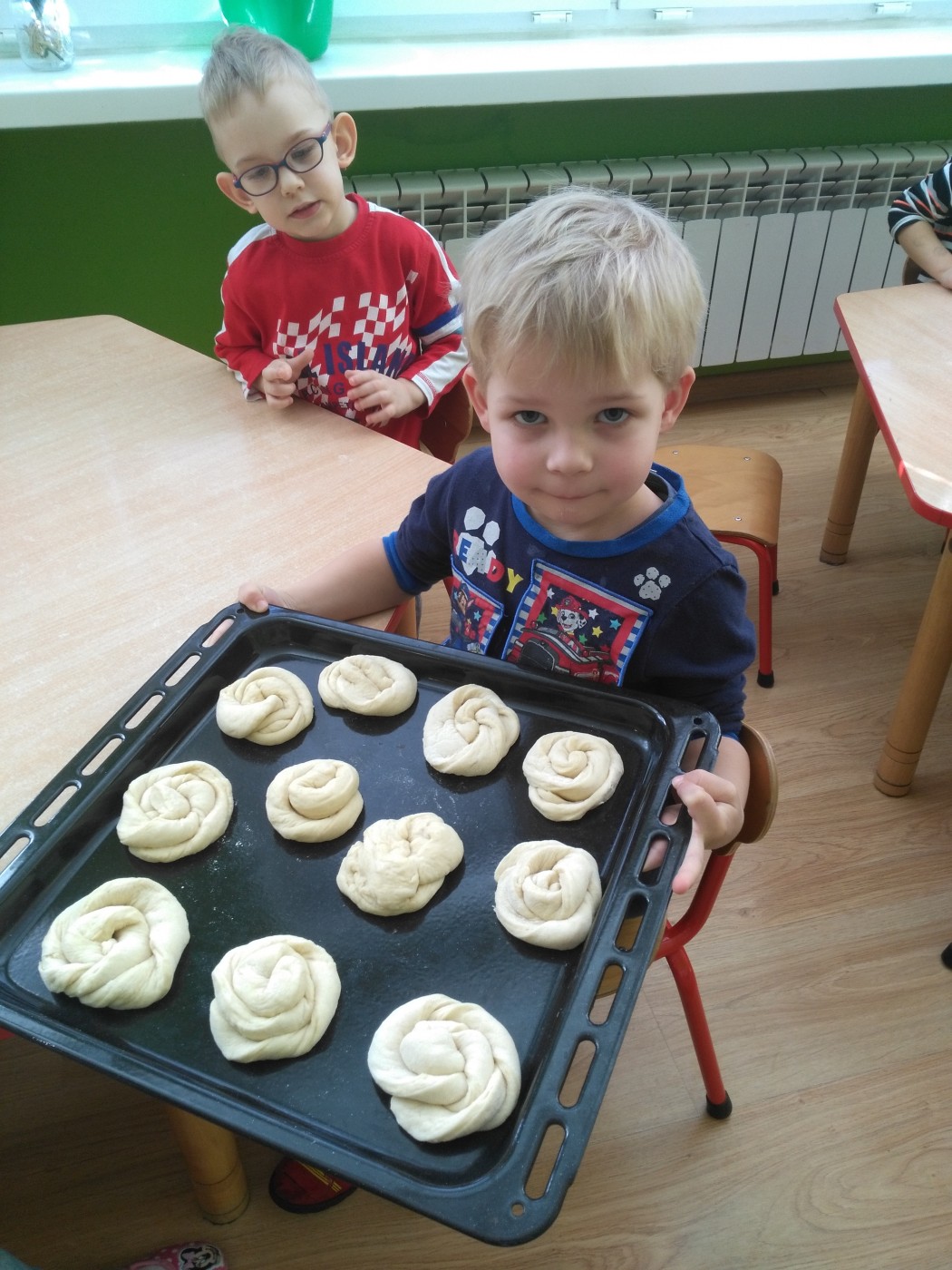 Opublikowano: 23-02-201922.02.2019 roku grupa Krasnoludków zaprosiła tatę Sandry – pana Szymona, który w ramach doradztwa zawodowego zapoznał dzieci z zawodem piekarza i cukiernika. Dzieci pod czujnym okiem naszego gościa zgłębiały tajniki sztuki piekarskiej. Przedszkolaki poznały składniki potrzebne do wyrobienia drożdżówek a następnie z niewielką pomocą nauczyciela i pana Szymona wlewały mleko, wsypywały mąkę, cukier a także wyrabiały ciasto. Krasnoludki formowały ślimaczki a z nich drożdżówki. Na koniec udekorowały słodkie przekąski kruszonką.