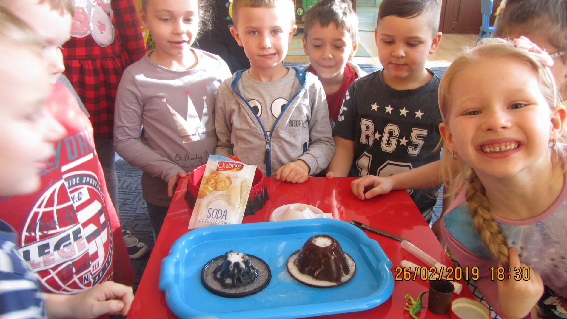 Opublikowano: 26-02-2019Dzieci z grupy Małych Odkrywców to bardzo ciekawe świata 6 – latki. Jedną z ich ostatnich pasji są wulkany. Dzieci poznały budowę wulkanów i ich rodzaje, dowiedziały się o występowaniu wulkanów na kuli ziemskiej, a także o ich niszczycielskiej i życiodajnej sile. Przedszkolaki dowiedziały się, że są wulkany wygasłe, drzemiące i czynne. Najciekawszą częścią był eksperyment, w którym dzieci mogły zaobserwować wybuch sodowego wulkanu. Następnie 6 – latki zrobiły wulkany z masy solnej.