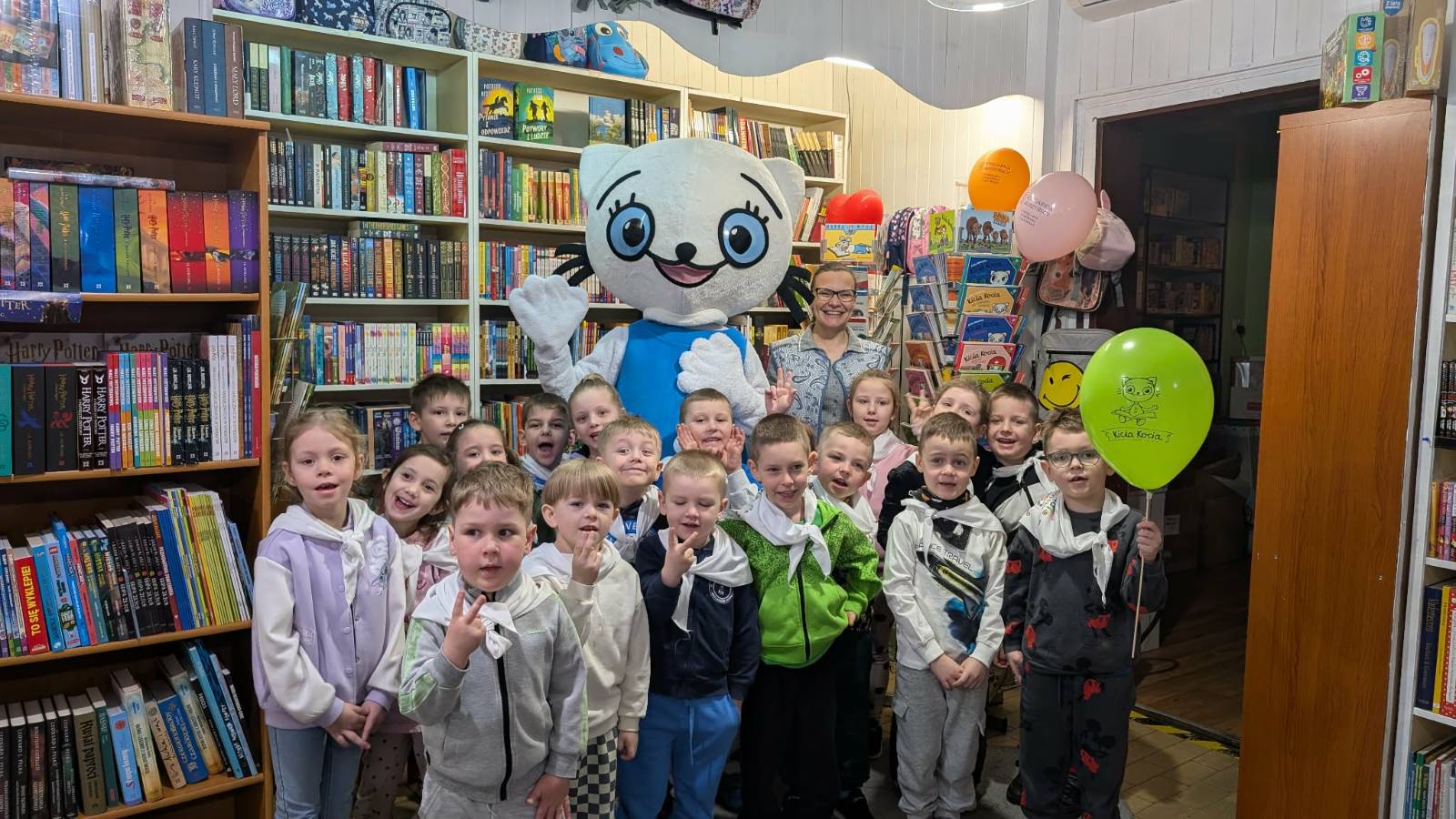 Opublikowano: 10-03-202610 marca grupa Małych Odkrywców odwiedziła Księgarnię Muszyńskich w Wągrowcu, gdzie wzięła udział w wyjątkowych zajęciach czytelniczych. Pani Monika przeczytała dzieciom książki o przygodach Kici Koci, które wzbudziły wiele uśmiechów i zainteresowania. Następnie zaprezentowała również inne ciekawe książki o tematyce wybieranej przez przedszkolaki. Dzieci chętnie wzięły udział w zabawie, odgadując przygotowane zagadki. Ogromną radość sprawiła dzieciom możliwość przytulenia maskotki Kici Koci. Na zakończenie spotkania każde dziecko otrzymało balonik oraz naklejkę z motywem Kici Koci. To było bardzo miłe i radosne spotkanie z książką.
