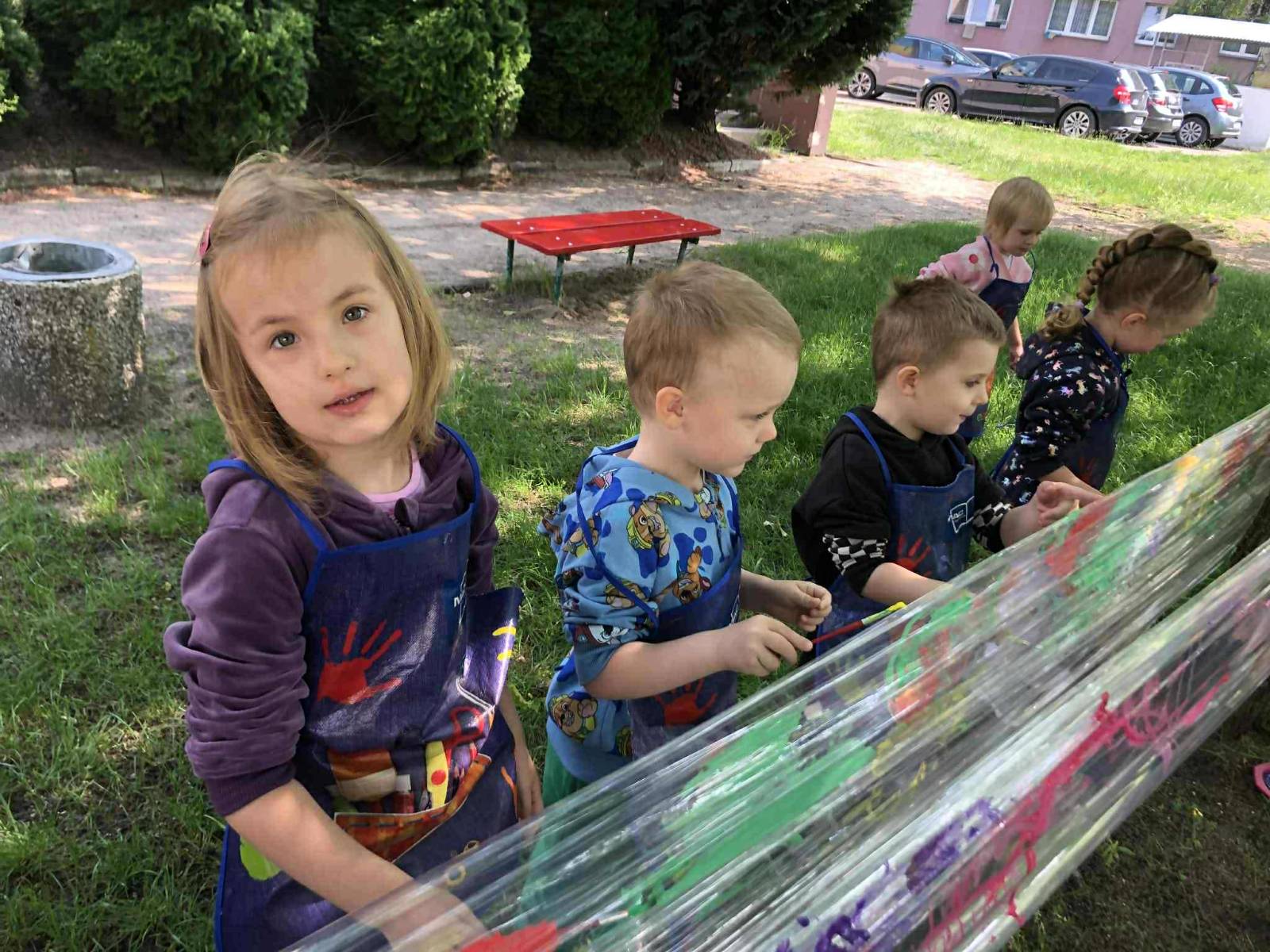 Opublikowano: 10-06-202510 czerwca 2025r. grupa Krasnoludków zamieniła się w plenerowych artystów. Korzystając z pięknej pogody „najmłodsi” wykonali letni pejzaż w ogródku przedszkolnym. Zabawa farbami pozwoliła rozwinąć kreatywność przedszkolaków integrując grupę do stworzenia wspólnego dzieła.
