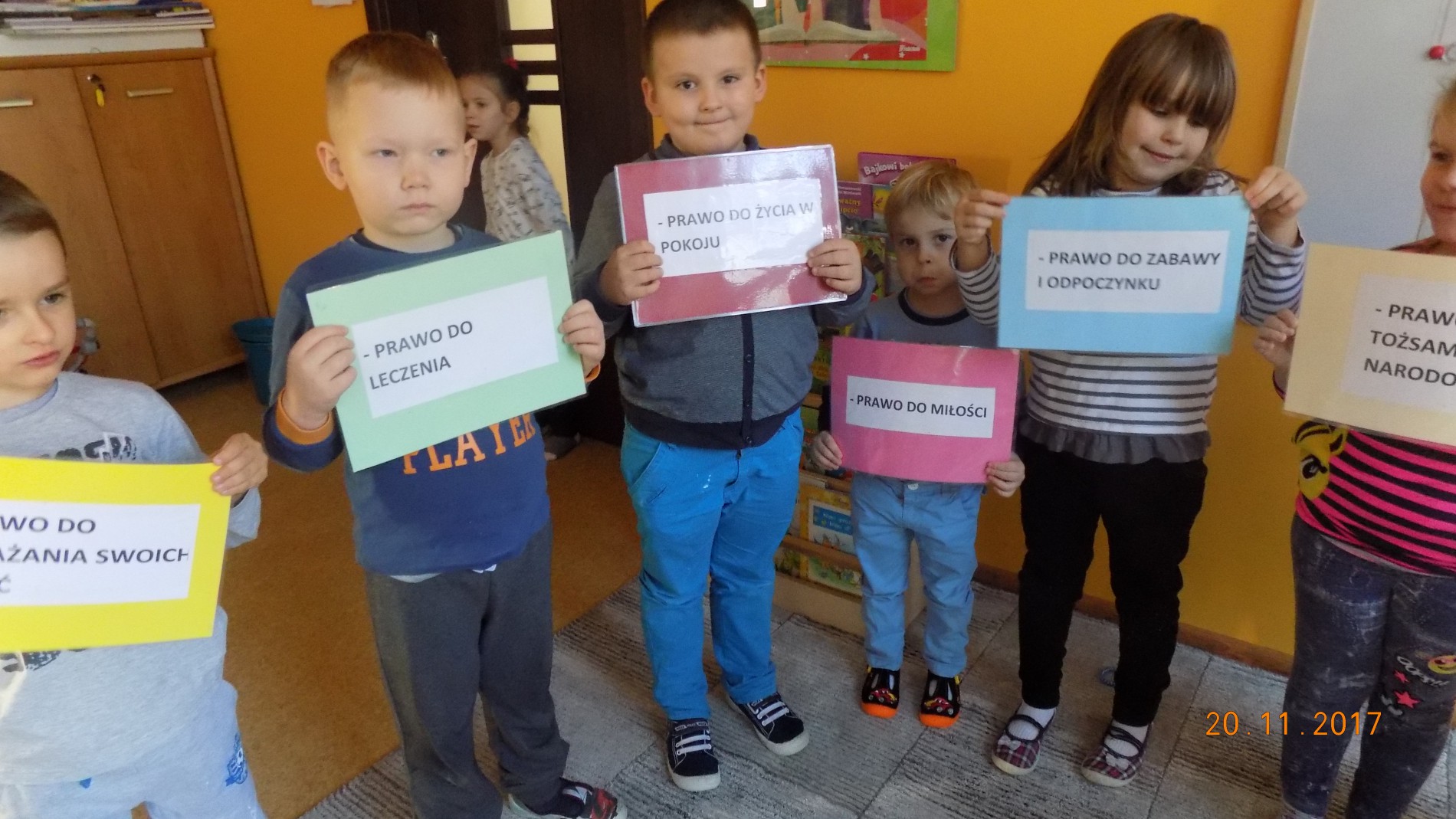 Opublikowano: 20-11-201720 listopada w naszym przedszkolu obchodziliśmy Ogólnopolski Dzień Przedszkolaka. Z tej okazji odbyły się zajęcia oraz pokaz multimedialny dotyczący praw dziecka. Miały one na celu kształtowanie świadomości dzieci w zakresie znajomości praw dziecka oraz konieczności ich przestrzegania przez dorosłych i dzieci. Przedszkolaki wiedzą już, że mają prawo do radości, uśmiechu, zabawy, spokojnej nauki i ciekawego poznawania otaczajacego nas świata.Dzień ten minął w radosnej atmosferze zabawy. Nie zabrakło też trudnych pytań i ciekawych refleksji.