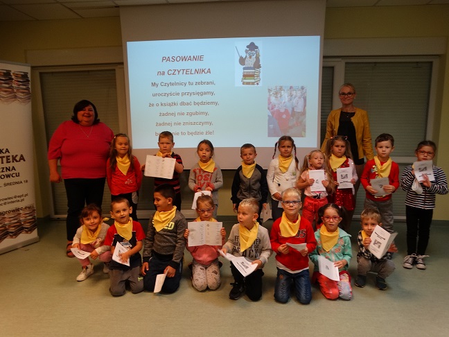 Opublikowano: 25-09-2018W poniedziałek dwie grupy starszaków powitały jesień w Miejskiej Bibliotece Publicznej. Mali Odkrywcy oraz Mali Przyrodnicy uczestniczą w XIII edycji cyklu Przedszkolaki w bibliotece. Przedszkolaki zostały osobiście z rąk p. Dyrektor Pasowani na Czytelnika. Gratulujemy![]()