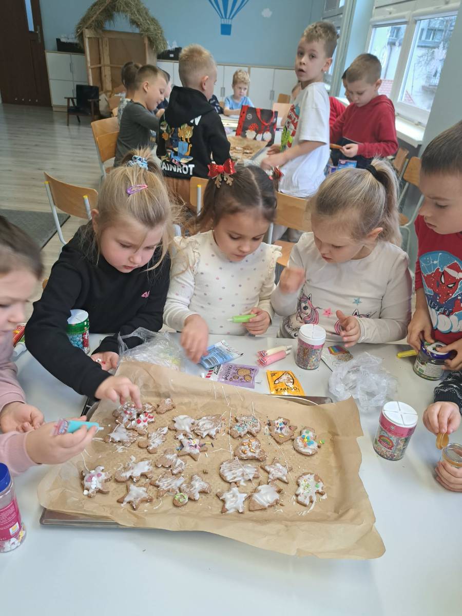 Opublikowano: 12-12-2025Święta tuż, tuż… czas więc na pieczenie pierników. Przez ostatnie dni w naszym przedszkolu unosił się wyjątkowy, świąteczny zapach. Dzieci z wielkim zaangażowaniem piekły pierniki – wałkowały ciasto, wycinały foremkami różne kształty i z radością układały je na blaszkach, które pod czujnym okiem naszych pań kucharek piekły się w piekarniku. Gotowe pierniki pięknie się zarumieniły, a ich aromat wypełniał każdą salę, wprowadzając wszystkich w ciepły, radosny nastrój. Następnie dzieci dekorowały je cukierkami, gwiazdkami, perełkami, kolorowymi pisakami. Nie zabrakło śmiechu, rozmów i pierwszych cukierniczych doświadczeń.