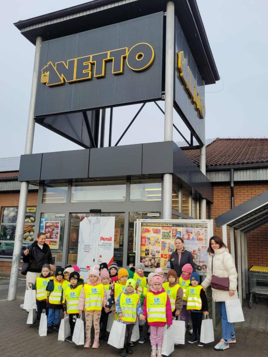 Opublikowano: 15-11-202514 listopada 2025r. dzieci z grupy Kubusie odwiedziły market spożywczy Netto. Przedszkolaki zapoznały się z pracą ekspedientki oraz wyposażeniem sklepu. Ponadto „najmłodsi” dowiedzieli się jak świadomie robić zakupy stosując zwroty grzecznościowe. Dzieci miały okazję obserwować pracę sprzedawcy,a także poznały artykuły sprzedawane w tym sklepie. Przedszkolaki z ogromnym zainteresowaniem oglądały wszystkie regały, półki i lodówki. Wizyta zakończyła się samodzielną próbą dokonania zakupów na kasie fiskalnej. Kubusie z radością wykonały pamiątkowe zdjęcie z personelem sklepu i podziękowały za otrzymane upominki..