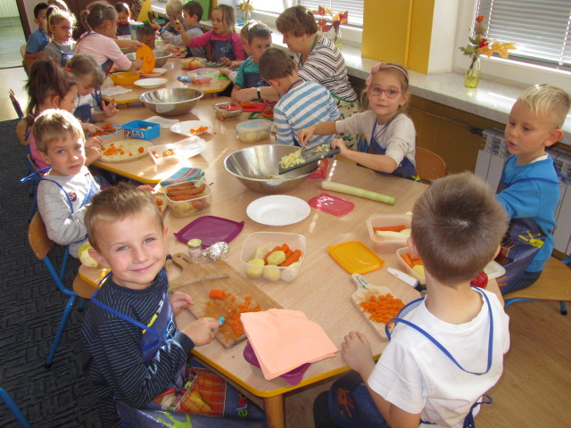 Opublikowano: 04-10-2018W myśl o witaminkach grupa ,,Małych Odkrywców'' postanowiła zrobić wspólnie pyszną sałatkę jarzynową. Przestrzegając zasad bezpieczeństwa przy posługiwaniu się nożem, krojenie warzyw dało dzieciom wiele satysfakcji. Każdy miał tackę, nożyk, talerz i przystąpił do krojenia.Dzieci samodzielnie kroiły i przyrządzały sałatkę. Przy tej okazji poznały wygląd, smak i zapach niektórych składników. Na koniec gotową sałatkę nałożyliśmy na talerze i w sali mieliśmy prawdziwą ucztę. Dzieci z wielkim apetytem zjadły wspólnie przygotowany posiłek.