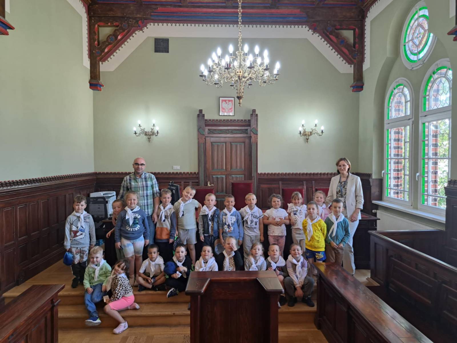 Opublikowano: 16-06-2025W ramach realizacji programu preorientacji zawodowej ,dzięki uprzejmości Pana Michała Wzięcha dzieci z grupy Małych Odkrywców wybrały się do Sądu Rejonowego w Wągrowcu. Pan Michał oprowadził Przedszkolaki po gmachu sądu oraz opowiedział im, jaką rolę pełni oraz kto w nim pracuje. Na sali rozpraw dzieci wcieliły się w rolę sędziego, adwokata, prokuratura, świadków, oskarżonego odrywając krótką scenkę. Przedszkolaki miały okazję przymierzyć togę i łańcuch z godłem. Na koniec mieliśmy możliwość spotkać się z panią Prezes naszego sądu. Przedszkolaki podziękowały za możliwość zwiedzania budynku. Nasze dzieci dzięki tej wizycie już wiedzą, co to jest prawo, kiedy je łamiemy, co robi się w sądzie i kto tam pracuje. Bardzo ślicznie dziękujemy Panu Michałowi za poświęcony czas, przekazanie wiedzy naszym przedszkolakom.