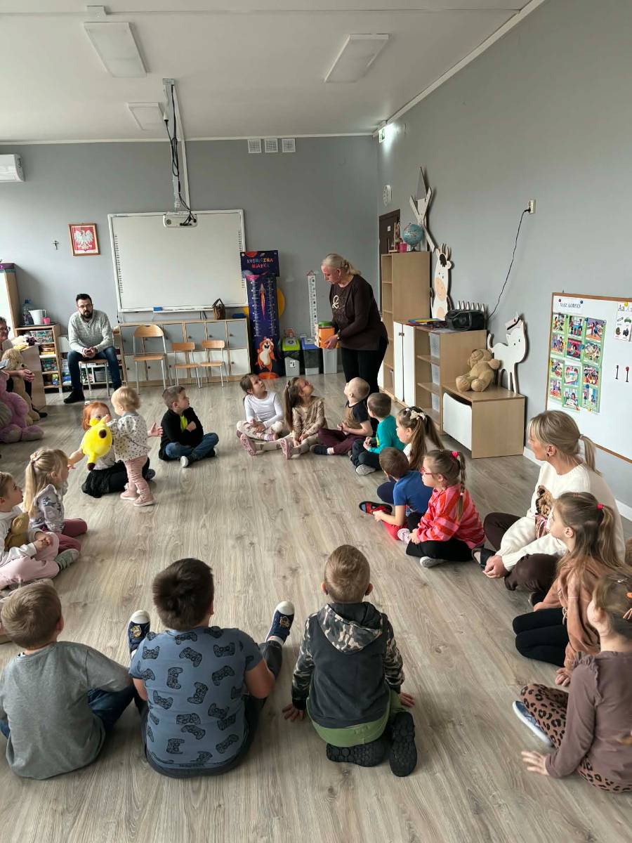 Opublikowano: 25-11-2025Dzieci z grupy Małych Przyrodników świętowały Światowy Dzień Pluszowego Misia razem z zaproszonymi gośćmi-rodzicami i babciami.Po przywitaniu i złożeniu życzeń Pluszowemu Misiowi wszyscy zostali zaproszeni do wspólnych zabaw.Były zagadki,pląsy, śpiewy. Rodzice zostali poddani testowi smaków, który zaliczyli wspaniałe.Momentem wyciszenia był masażyk oraz bajka logopedyczna o misiu.Rodzice okazali się także wspaniałymi artystami rysując misia z zakrytymi oczami.Spotkanie przebiegało w miłej I serdecznej atmosferze i sprawiło dzieciom dużo radości.