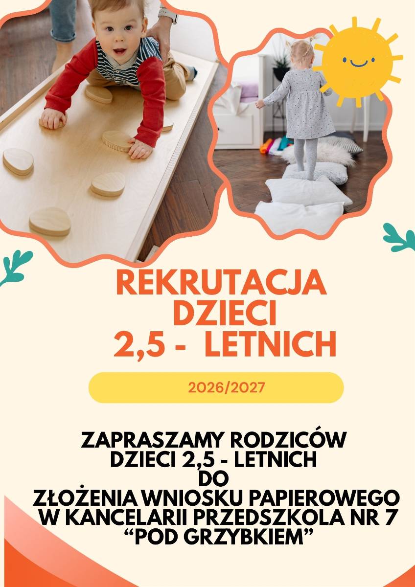 Opublikowano: 10-03-2026Zapraszamy Rodziców dzieci 2,5- letnich do złożenia wniosku w wersji papierowej w kancelarii naszego przedszkola.