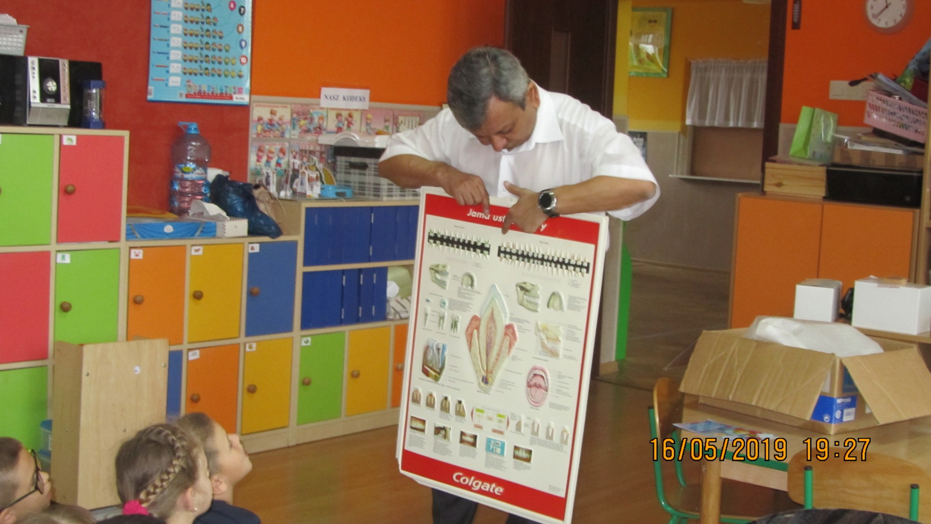 Opublikowano: 16-05-201916.05.2019 roku dzieci z grupy "Małych Odkrywców" i "Małych Przyrodników" odwiedził lekarz stomatolog A. Goel w ramach programu "Super Wiewiórka". Podczas tego spotkania dzieci obejrzały film edukacyjny, który przybliżył dzieciom istotę dbania o codzienną higienę jamy ustnej. Na modelu szczęki dzieci utrwaliły etapy mycia zębów. W ramach doradztwa zawodowego pan doktor przybliżył dzieciom zawód stomatologa. Na zakończenie spotkania przedszkolaki otrzymały pastę do zębów i naklejkę "odważny pacjent". Spotkanie uwieńczyło wspólne grupowe zdjęcie z miłym gościem.